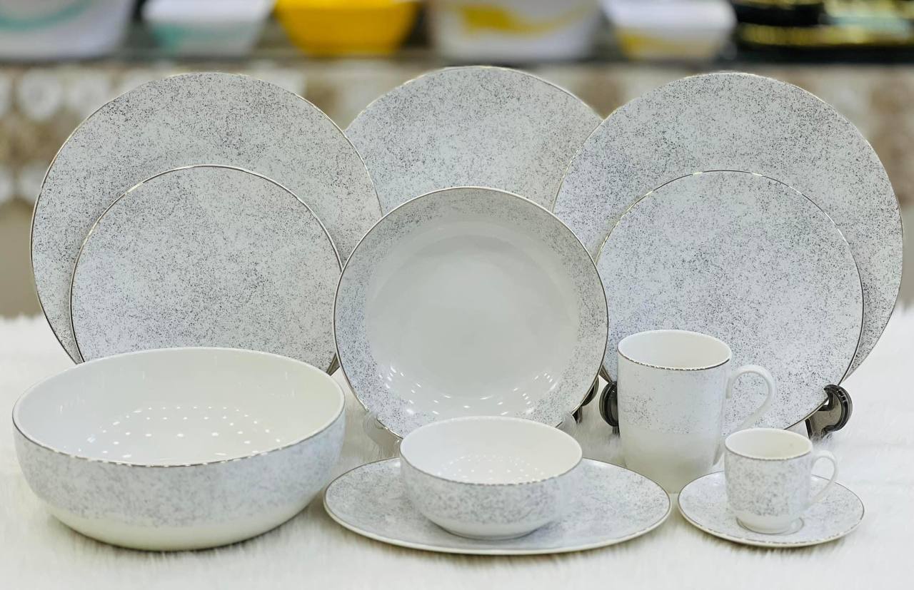 Fathy Mahmoud 46-piece porcelain dinner set - Includes 6 large flat plates + 6 cake plates + 6 serving plates + 6 soup bowls + 6 coffee mugs + 6 coffee cups + 6 coffee saucers + 2 oval servers + 1 large server + 1 large bowl